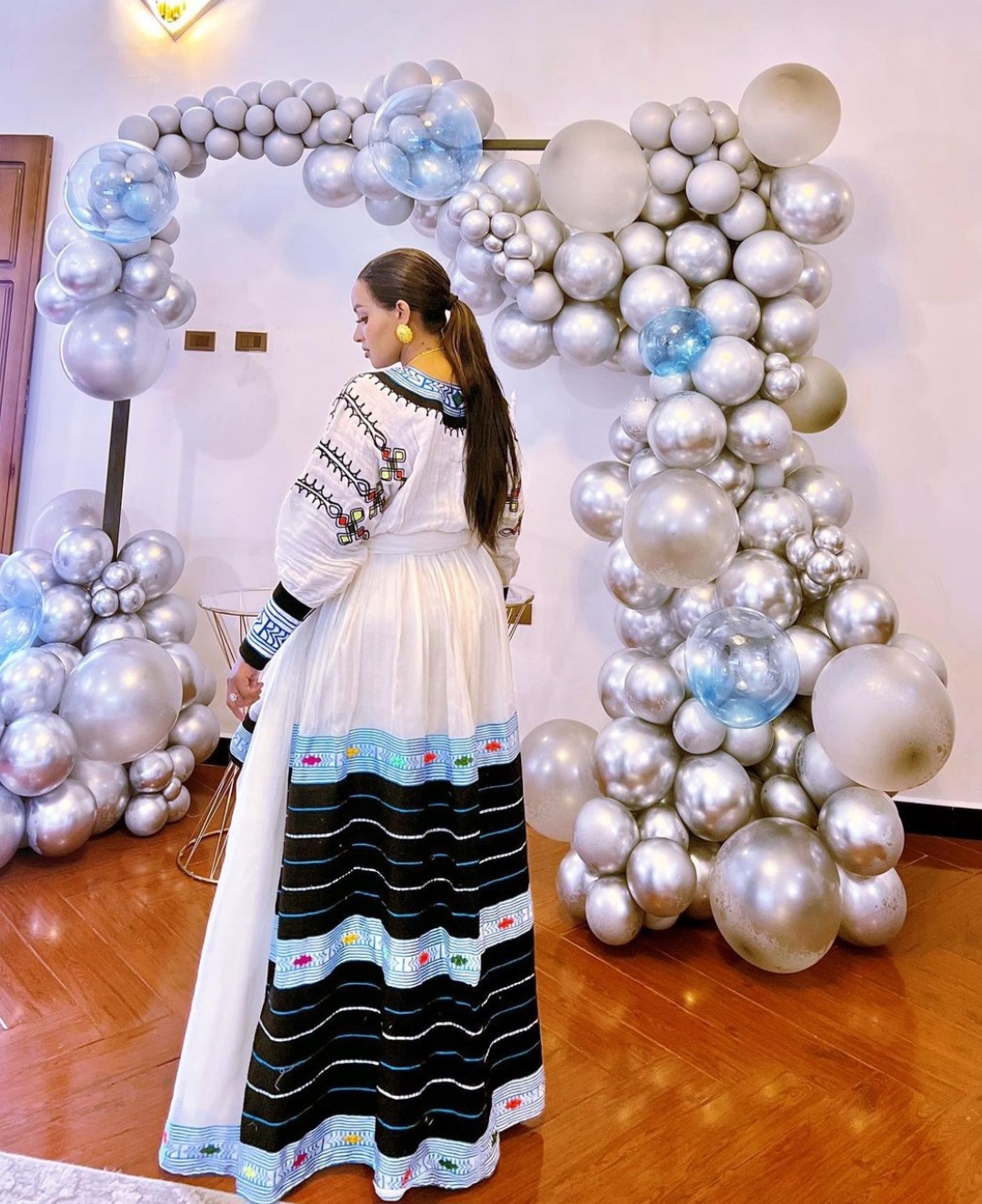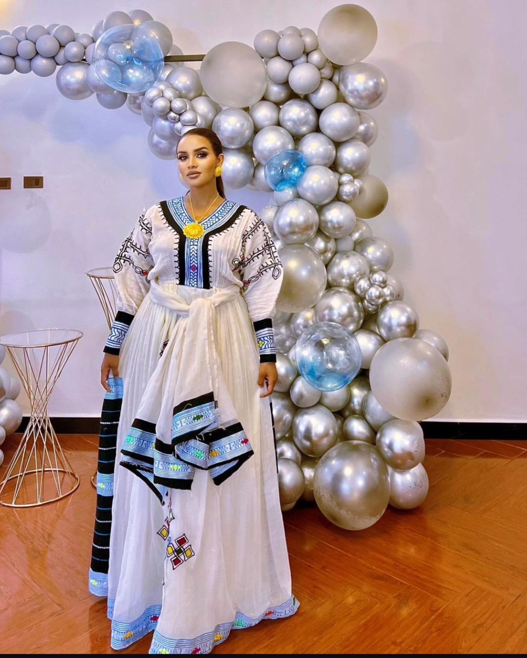 The colorful Habesha Kemis showcases a captivating blend of intricate patterns and vibrant hues, embodying the essence of Ethiopian traditional dress. Featuring a bold blue design, this attire is adorned with detailed embroidery and geometric motifs that resonate with Ethiopia’s rich cultural tapestry. The dress’s flowing silhouette and meticulous craftsmanship capture the spirit of Ethiopian heritage, offering a stunning testament to the country’s artistic tradition and enduring cultural pride.