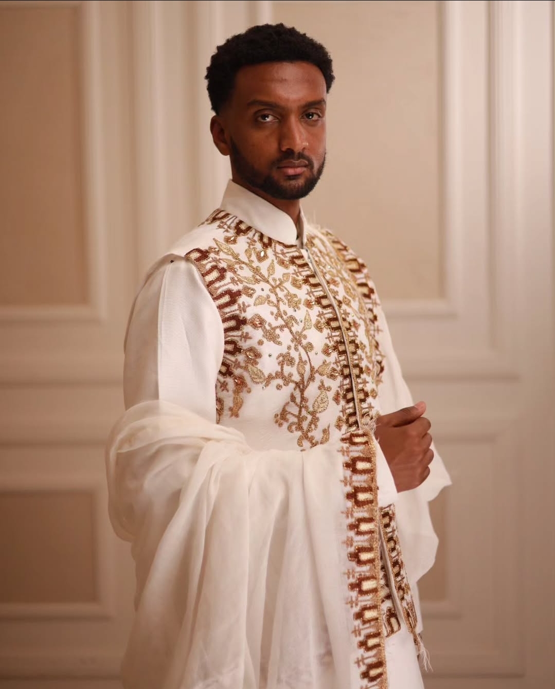 Imperial Men’s Ethiopian Outfit Handcrafted Habesha Clothing with Gold Embroidery Elegant Men’s Habesha Cloth Includes Netela and Pants